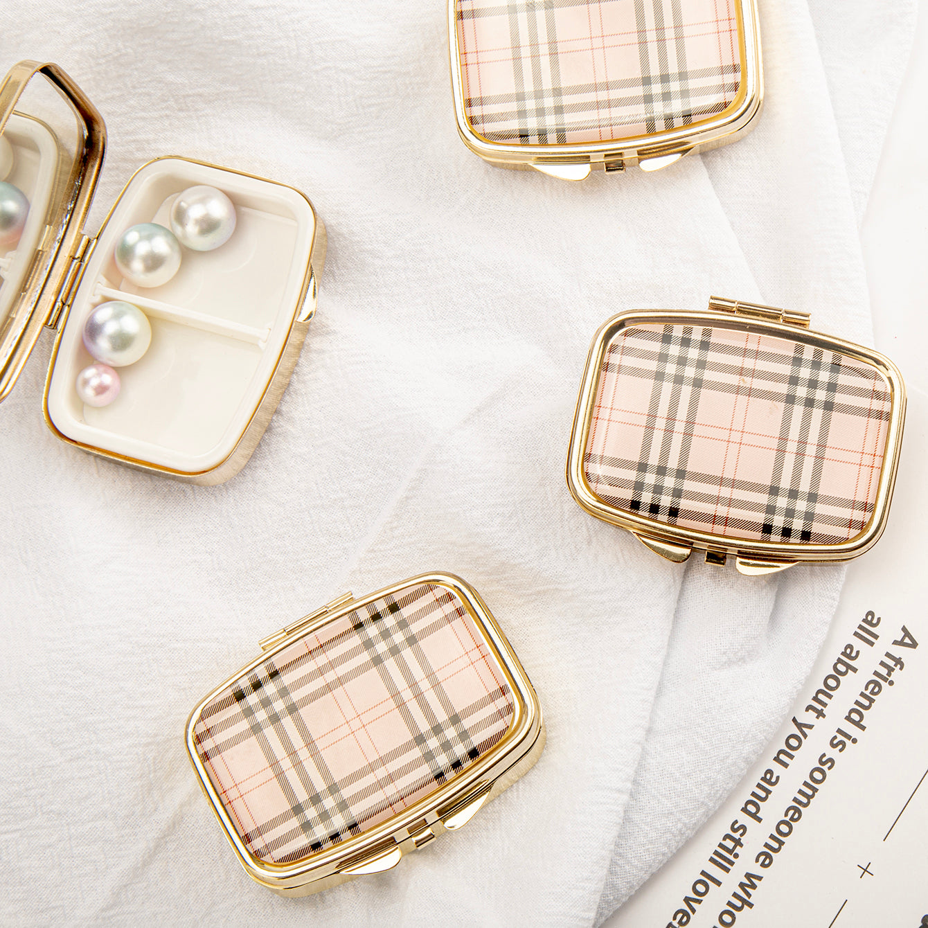 We proudly present our Epoxy Drip Glue Button Pill Organizer, available in both silver and gold plating. This unique rectangular organizer features two compartments for easy arrangement of pills or small items. The exterior of the compartments showcases exquisite printed patterns, adding an elegant touch to the entire organizer.