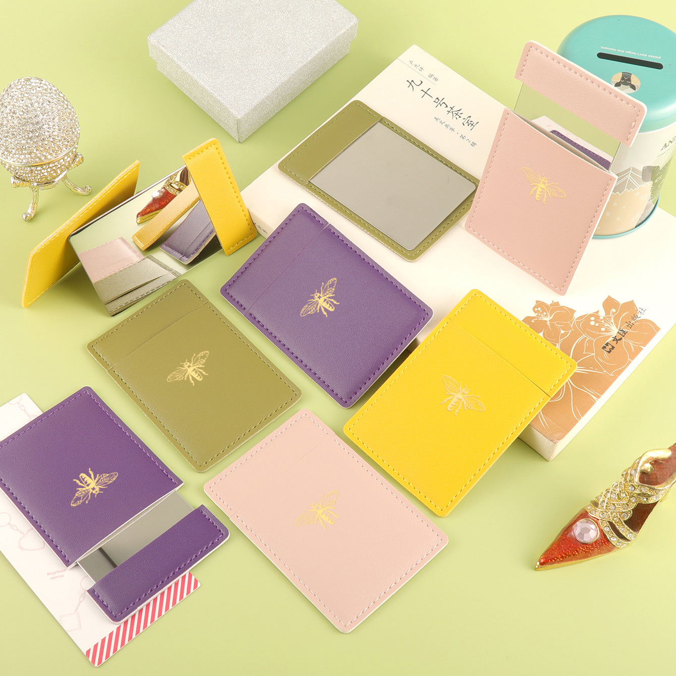 Fashion First Choice, Eco-Friendly PU Small Package, Containing Cute Little Bees, HD Stainless Steel Mirror, 63*95mm Rectangular Cosmetic Mirror, Four Colors to Choose From