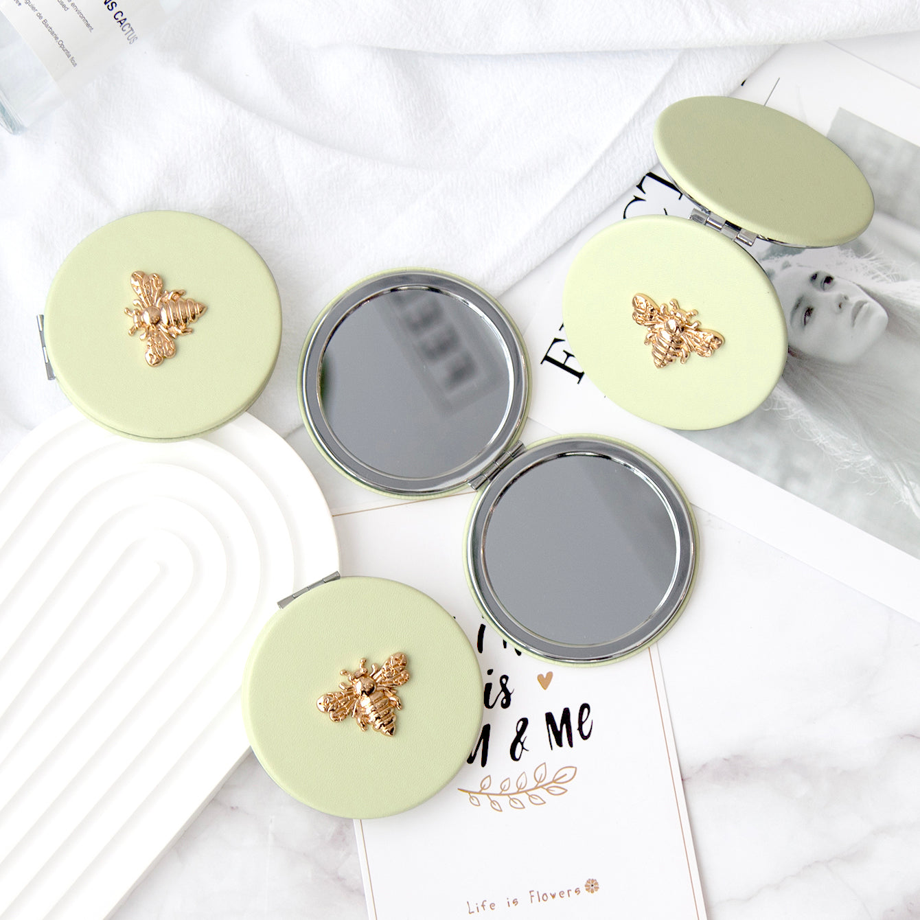 PU Eco-Friendly Leather With Metal Bee Decoration, Plating Silver Frame, And HD Glass Create A Fashionable Round Cosmetic Mirror With A Diameter Of 70mm, Making Your Makeup More Refined And Charming