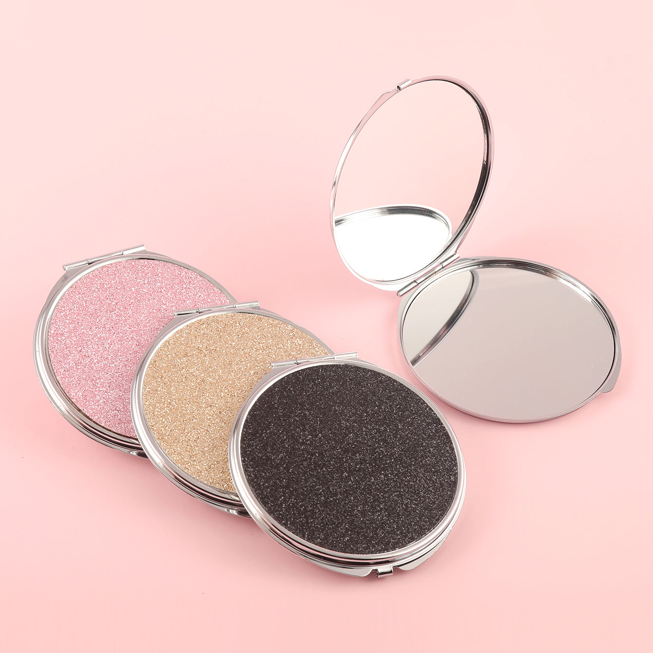 Pu Glitte Leather Plating Silver Round Vanity Mirror! Enjoy the Bright Brilliance Brought by HD Glass, and the 85*80mm Size Perfectly Matches Your Beauty Table. Pink, Blue, Black and Yellow,Multiple Choices to Show Your Personality.